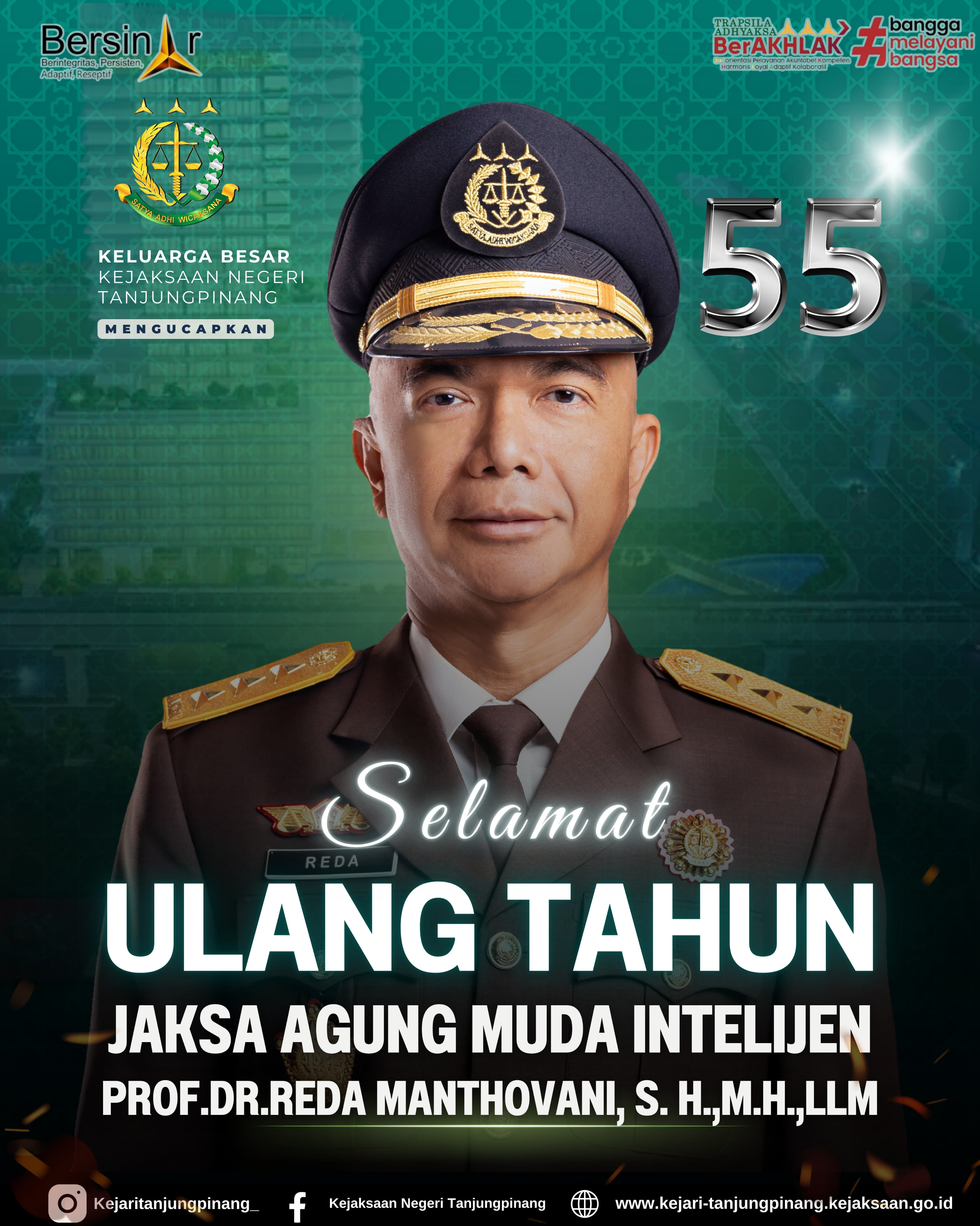 Keluarga Besar Kejaksaan Negeri Tanjungpinang mengucapkan Selamat Ulang Tahun Jaksa Agung Muda Intelijen Bapak Prof. Dr. Reda Manthovani, S.H.,M.H.,LLM, yang ke-55.